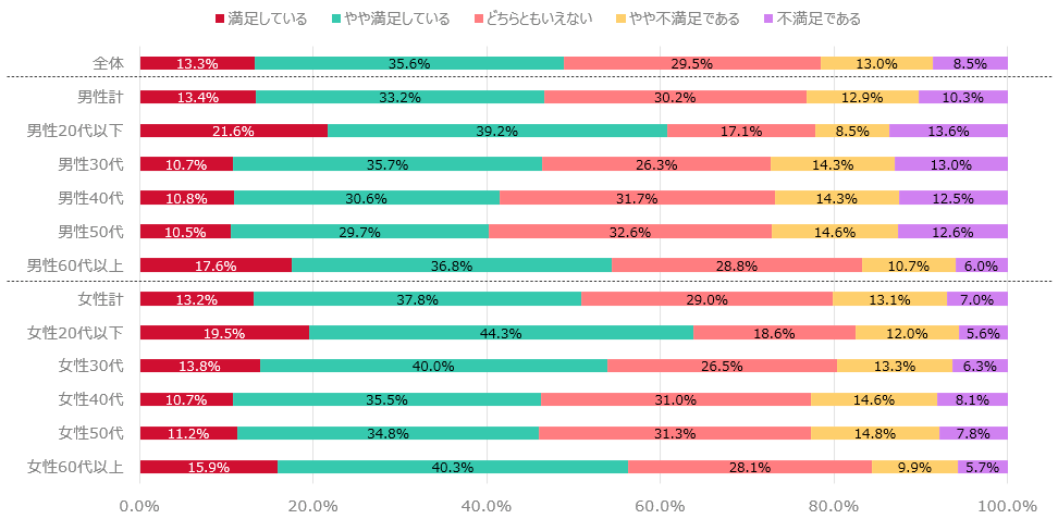 - 男女ともに20代以下や60代以上で満足の割合が高く、逆に40代-50代では低い結果となった。