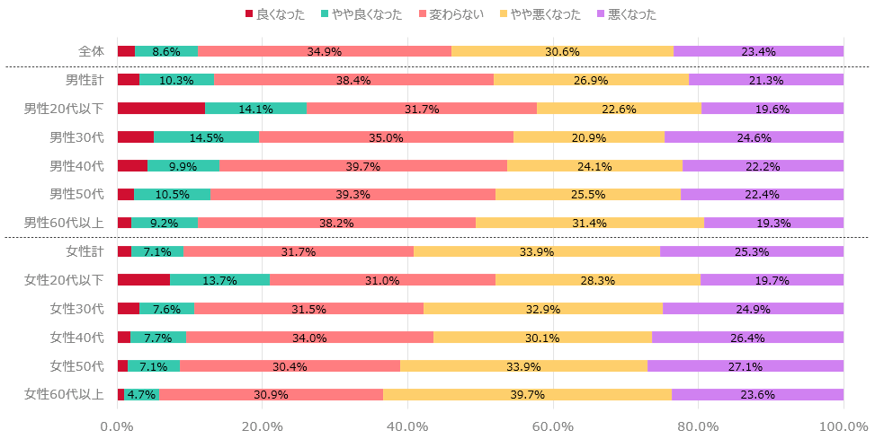 - 男女ともに年代が上がるにつれて、良くなったが減り、悪くなったが増える結果となった。