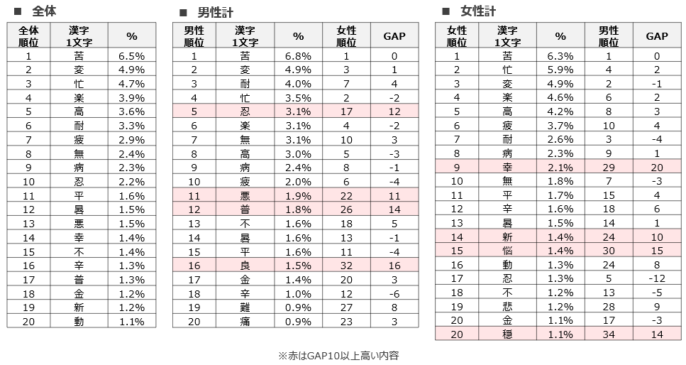 - 2024年はどんな1年でしたか、漢字1文字で聞いたところ、上位5位は、「苦」、「変」、「忙」、「楽」、「高」という結果となった。