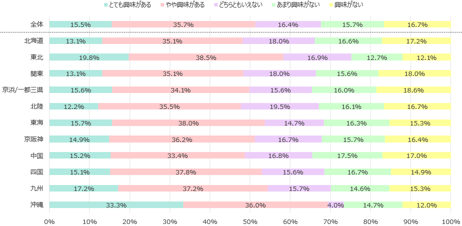 - 居住エリア別で確認すると、沖縄で「とても興味がある」と「やや興味がある」の合計値が69.3%と他のエリアと比べて高い状況となった。次いで東北も58.3%と高い状況である。