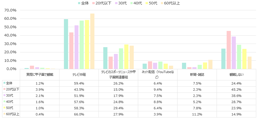 - 今年の夏の全国高校野球選手権大会をどのように観戦するのかを聞いたところ、「テレビ中継」が最も高く59.4%であった。年代が上がるにつれて高くなる。