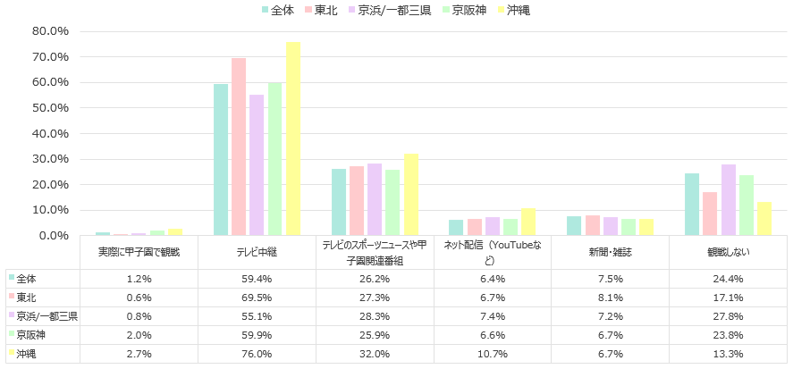 - 今年の夏の全国高校野球選手権大会に興味が高いエリアである東北、沖縄と、全体、京浜/一都三県、京阪神を比較すると、沖縄、東北ともに「テレビ中継」で観戦する割合が高く、特に沖縄は76.0%であることが分かった。