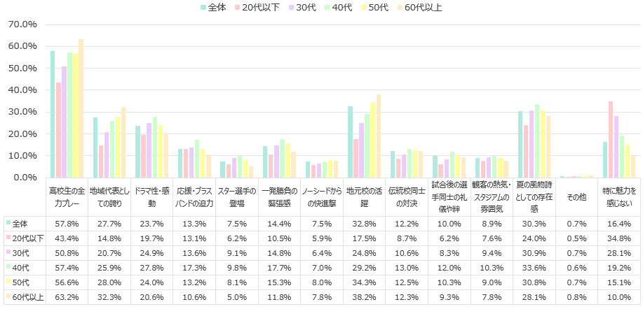 - 全国高校野球選手権大会の魅力として共感できることを聞いたところ、「高校生の全力プレー」が最も高く57.8%、次いで「地元校の活躍」が32.8%となった。ともに年代が上がるにつれて割合は高くなっている。