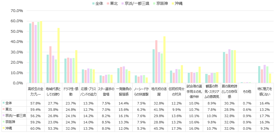 - 今年の夏の全国高校野球選手権大会に興味が高いエリアである東北、沖縄と、全体、京浜/一都三県、京阪神を比較すると、「高校生の全力プレー」はどの地域でも高いが、「地域代表としての誇り」や「地元校の活躍」は沖縄、東北で高いことが分かる。
