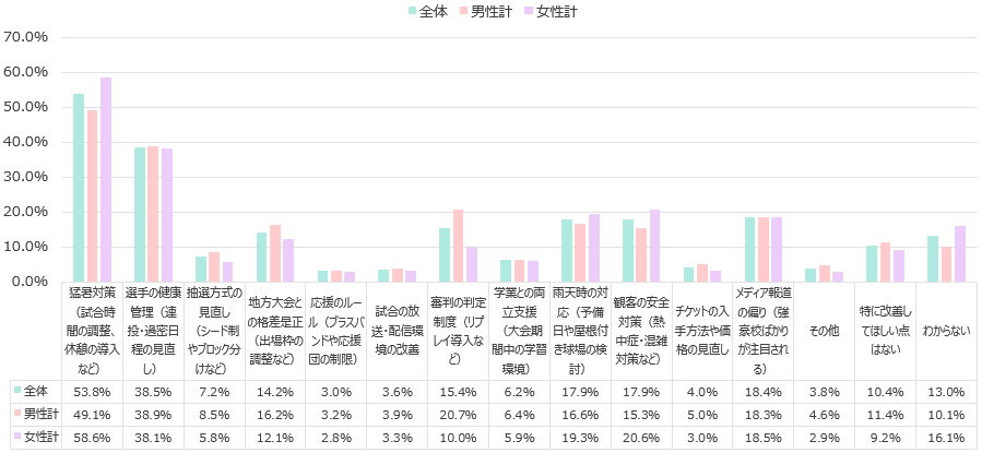 - 全国高校野球選手権大会に改善してほしい点を聞いたところ、「猛暑対策」、「選手の健康管理」が高い結果となった。
